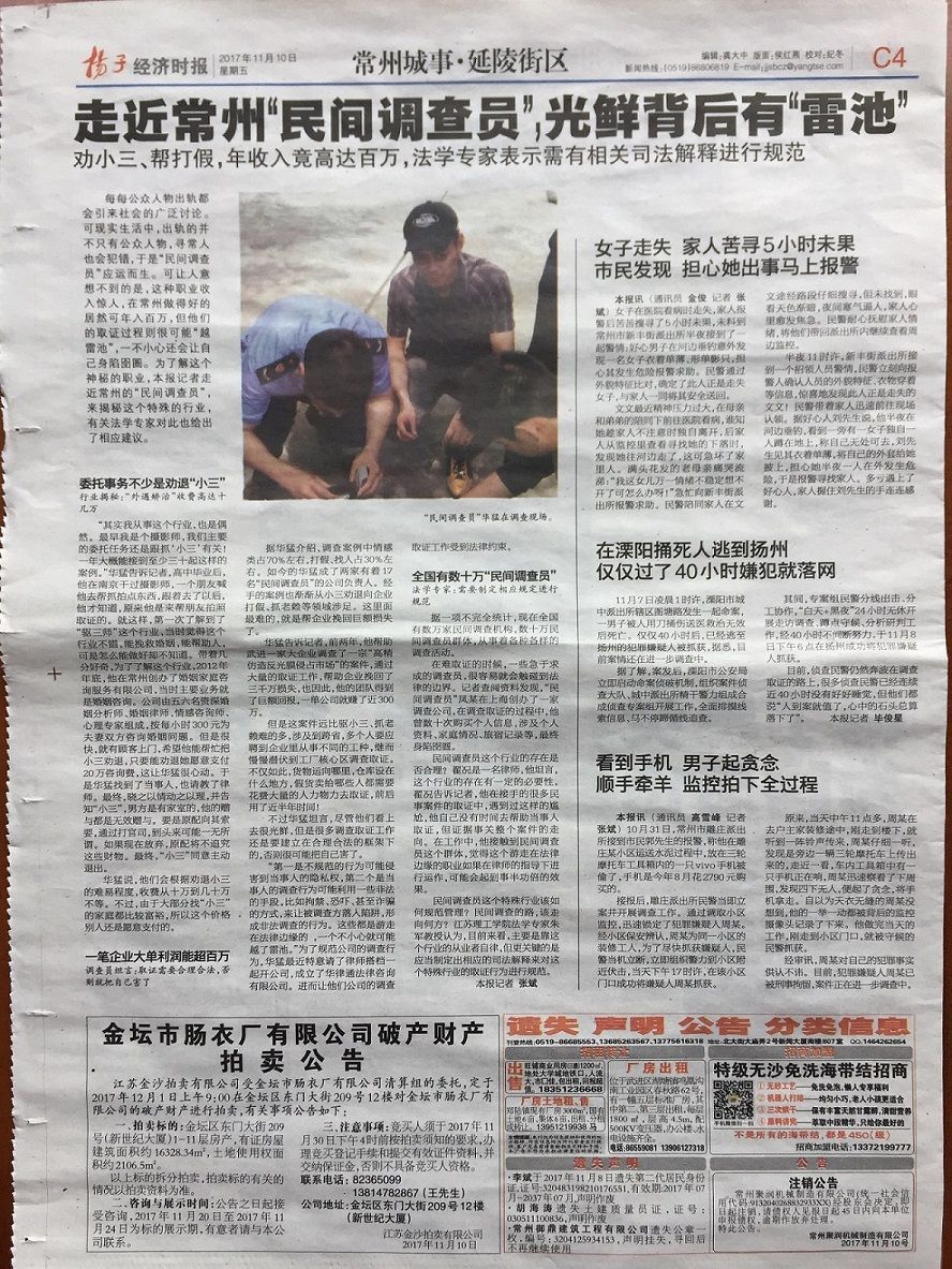 常州.江苏决胜调查名事务所:发起人-华先生(华先生)2017年11月10日接受《扬子晚报》C4版专栏采访报道与好评