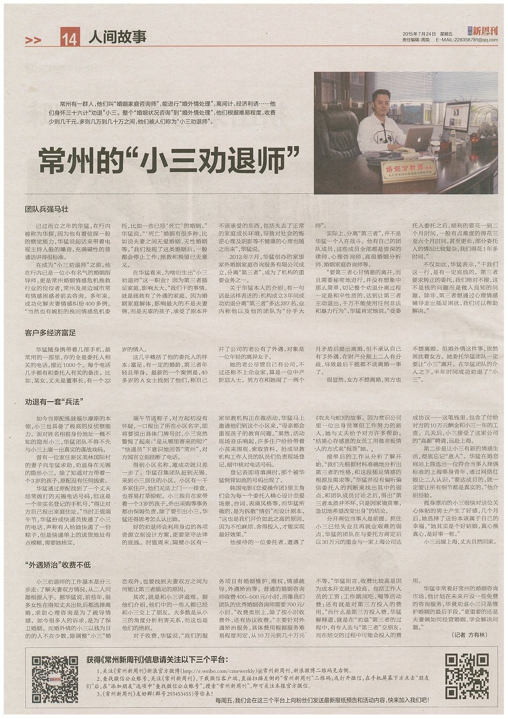常州.江苏决胜调查名事务所:发起人-华先生(华先生)2015年7月24日《新周刊》14版整版采访报道与好评